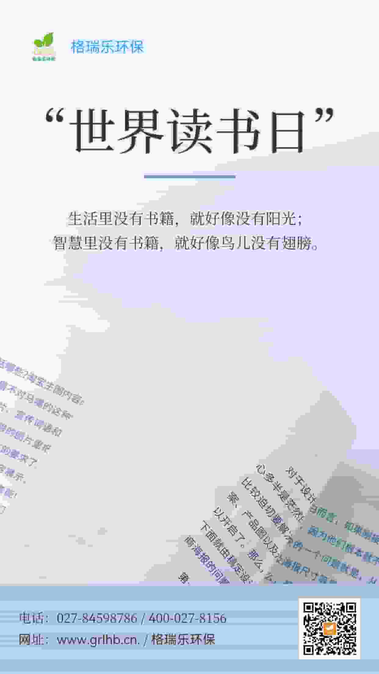 在世界讀書日,讓我們一同翻開環(huán)保的畫卷,邁向綠色的未來!格瑞樂環(huán)保,與你并肩,以智慧呵護(hù)我們的地球,使每一幅畫面都展現(xiàn)出環(huán)保的決心與使命,讓我們一起為美好世界而讀!你愿意與格瑞樂環(huán)保一同前行嗎?
